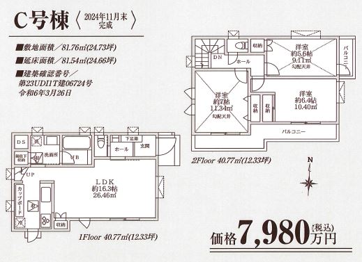 | 建物面積 | 81.54㎡(約24.66坪) 1階40.77㎡(12.33坪) 2階40.77㎡(12.33坪) |