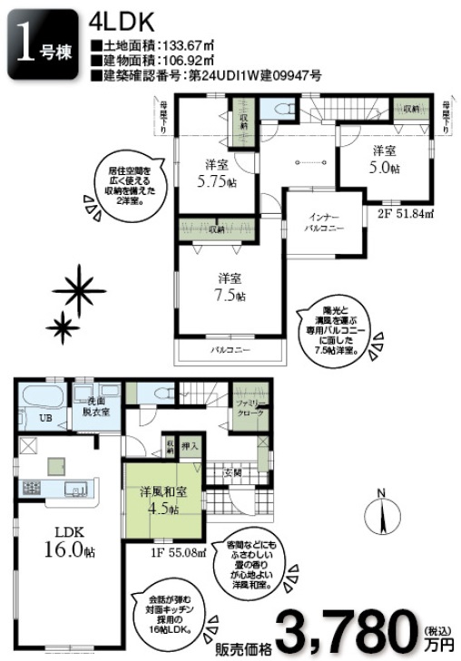 | 建物面積 | 106.92㎡(1F:55.08㎡ 2F:51.84㎡) |